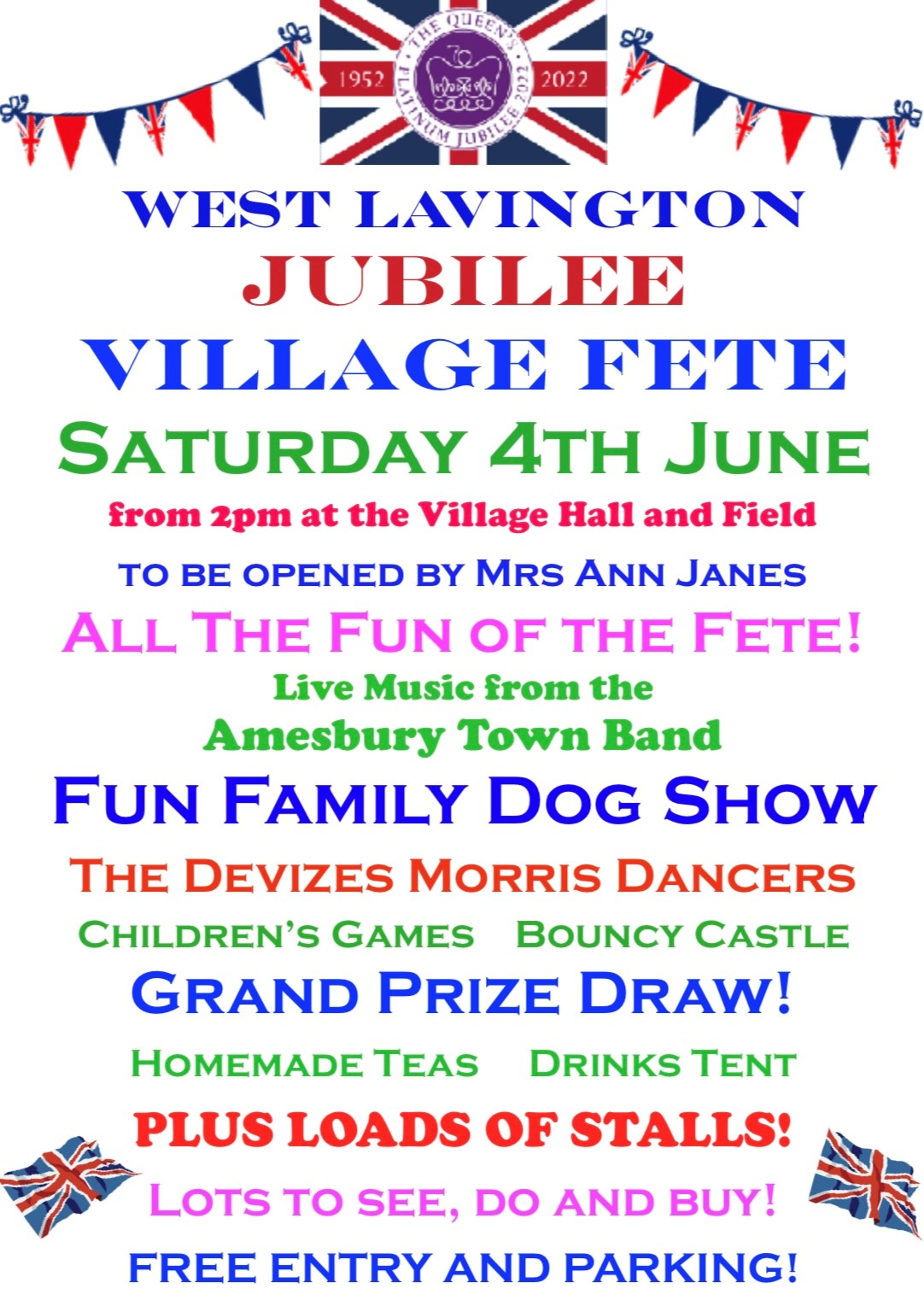 West Lavington Jubilee Fete will take place on Saturday 4th June from 2pm at the Village Hall and Field.